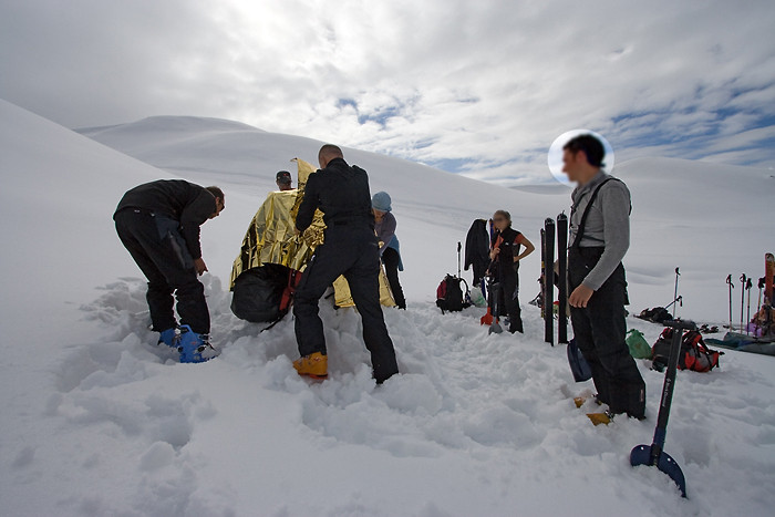 La construction commence : on empile plusieurs sacs à dos qu’on recouvre d’une couverture de survie. Ensuite on va recouvrir le tas avec de la neige.