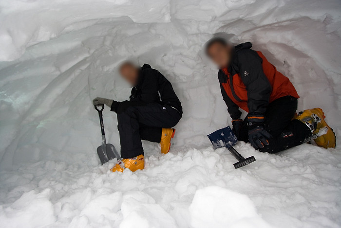 Ensuite, deux personnes creusent pour extirper les sacs pendant que les autres continuent à mettre de la neige par dessus pour augmenter l’épaisseur de neige sur le futur toit.